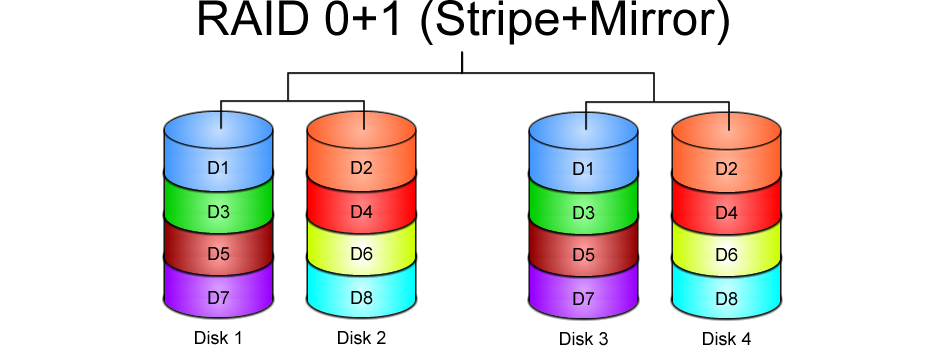 RAID 1 ¦ +-+ ¦ ¦ RAID 0 RAID 0 +++ +++ ¦ ¦ ¦ ¦ ¦ ¦ 120GB 120GB 120GB 120GB 120GB 120GB Lo spazio totale θ di 360GB, divisi tra due sistemi. Il vantaggio principale θ che quando un disco si rompe tra quelli del RAID-0, i dati mancanti possono essere trasferiti dall'altro RAID-0. Comunque, aggiungere un disco richiede di aggiungere due dischi per bilanciare lo spazio tra i due sistemi. Il sistema non θ cosμ robusto come il RAID 1+0 e non puς sopportare la rottura simultanea di due dischi, se non appartengono alla stessa famiglia di RAID 0. Cioθ, se un disco si rompe, ogni altro disco dell'altra stripe (riferita al RAID 1) θ un elemento critico per il sistema. Inoltre, se un disco viene sostituito, per ricostruire il sistema devono partecipare tutti i dischi dell'insieme RAID 0 ancora funzionante.